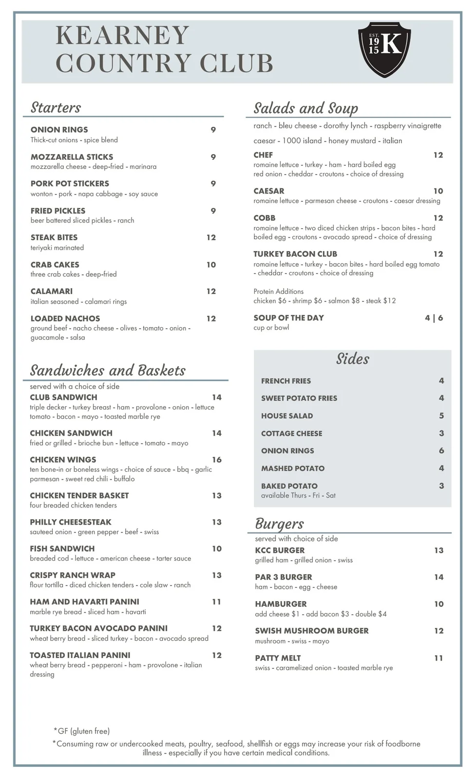 Menu Menus Menu Weekly Specials Kids Menu About Us Kearney Country Club aims to provide a superior golf, social and food & beverage experience through excellent service, course conditions, and a family friendly atmosphere. Privacy Policy