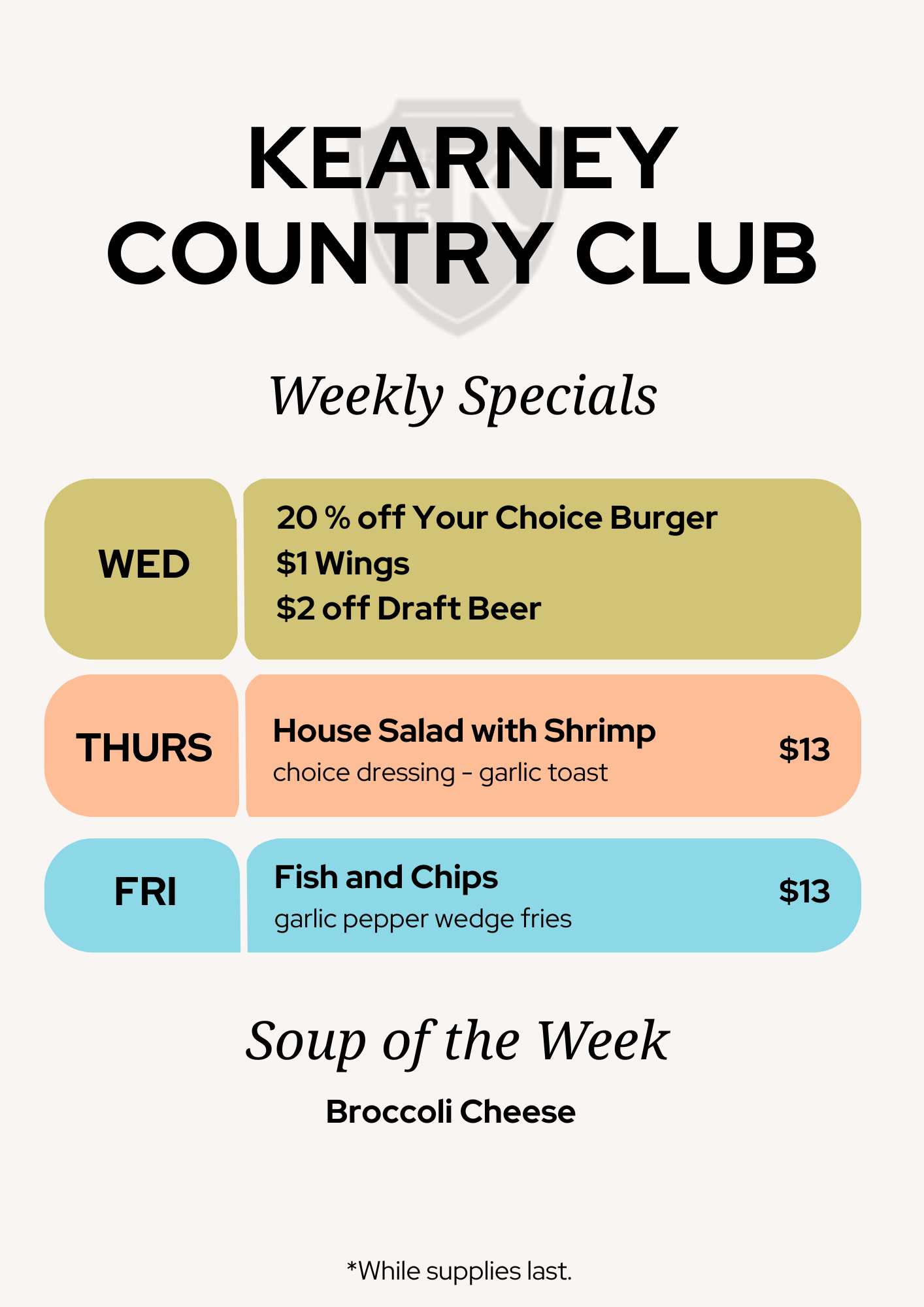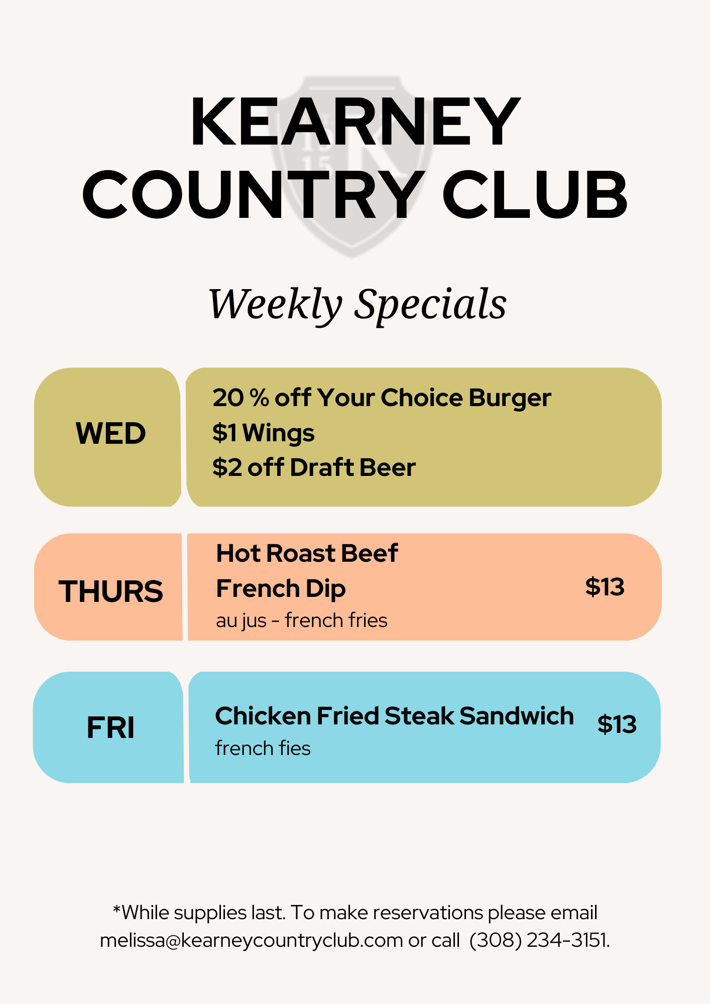 Weekly Specials Menus Menu Weekly Specials Kids Menu About Us Kearney Country Club aims to provide a superior golf, social and food & beverage experience through excellent service, course conditions, and a family friendly atmosphere. Privacy Policy